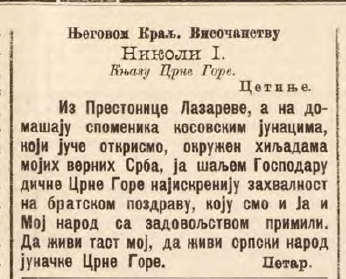 From the Capital of Lazar, and near the monument to the Kosovo heroes which we unveiled yesterday, surrounded by thousands of my loyal Serbs, I send to the Lord of noble Montenegro my sincerest thanks for the fraternal greeting, which both I and my people have received with pleasure. May my father-in-law thrive, may the brave people of heroic Montenegro live long.